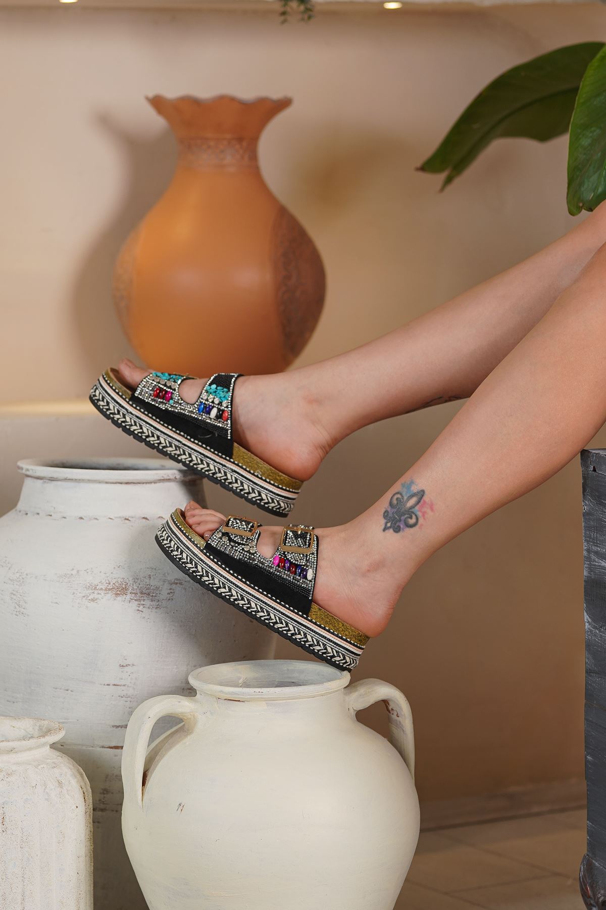 GUJA KADIN TERLİK 10325Y-Dış Materyal : Suni Deri Taşlı Malzeme İç Materyal : Suni Deri Taban Materyal : Eva Topuk boyu : 4 cm